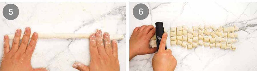 The dough will be too sticky to knead. But because of the way the gnocchi is rolled and cut, it can be very sticky on the inside, we just use flour on the outside to make it manageable. (See next steps)