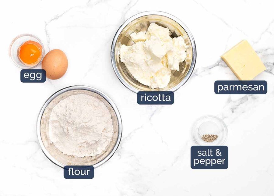 Ricotta – Use regular ricotta that is kind of lumpy when you scoop it up (see video). Not the creamy, smooth spreadable type of ricotta (usually labelled “spreadable ricotta” 0r similar.) That is too wet and loose, which will make the dough too sticky.