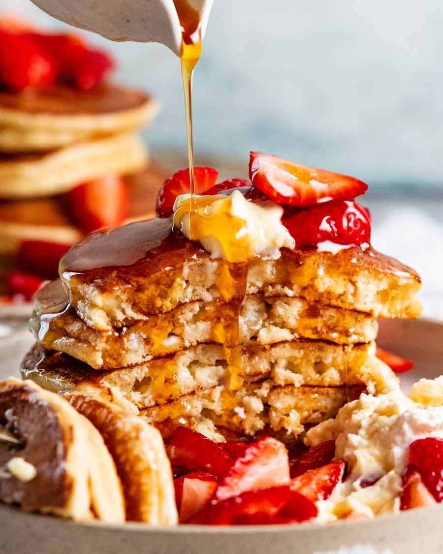 - Serve ricotta pancakes with macerated strawberries (below), softened butter and copious amounts of maple syrup!