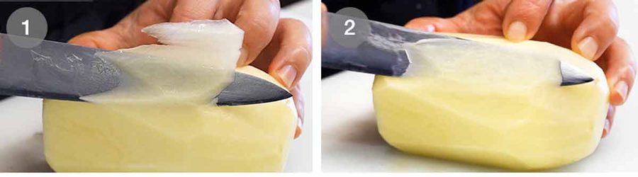 Trim base – For all methods, the first step is to peel the potatoes then trim a bit off the top and bottom so it stands upright. It just makes it easier to handle.