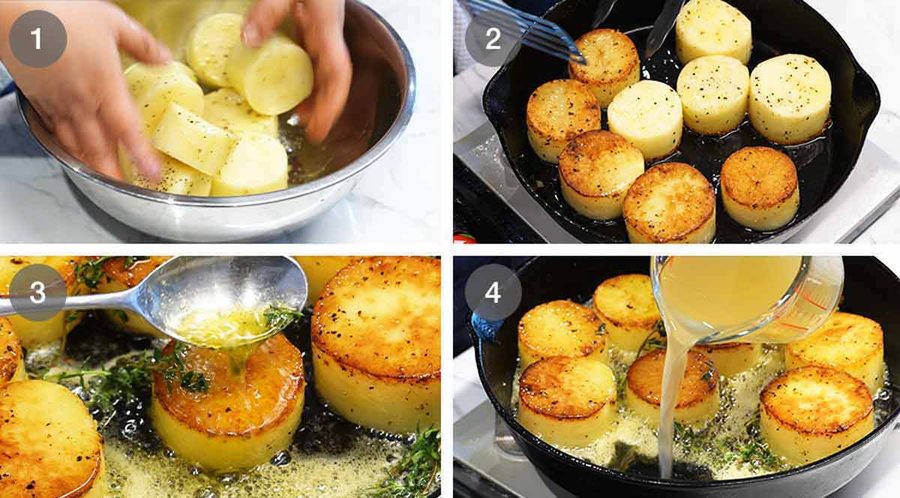 - Sear – In an ovenproof heavy based skillet (Note 2), heat the remaining 1 tbsp oil over medium high heat. Put the potato in and cook each side for 6 – 8 minutes or until golden.