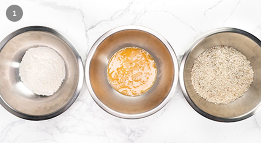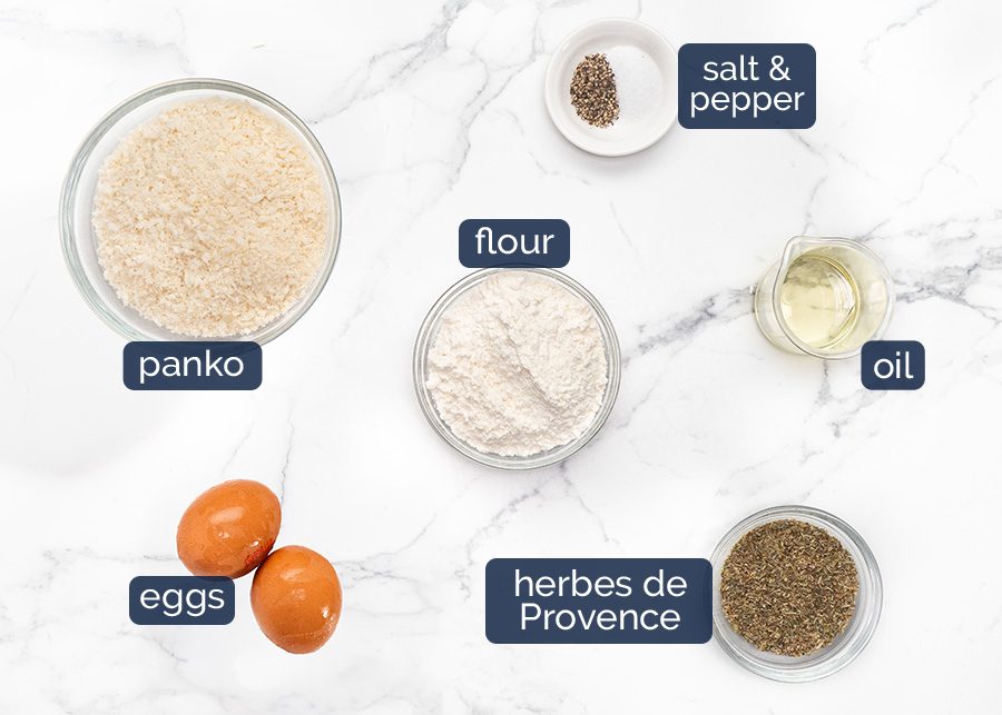 - Prepare the crumbing station – Place flour, eggs, and panko mixed with herbes de Provence in three separate bowls. (Note 7)