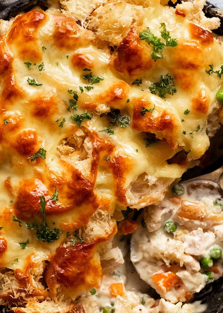 The idea for a crunchy buttery bread topping rather than puff pastry that Chicken Pot Pie is traditionally made with came about because the year I originally published this recipe I had a load of stale bread lying around and no puff pastry.
