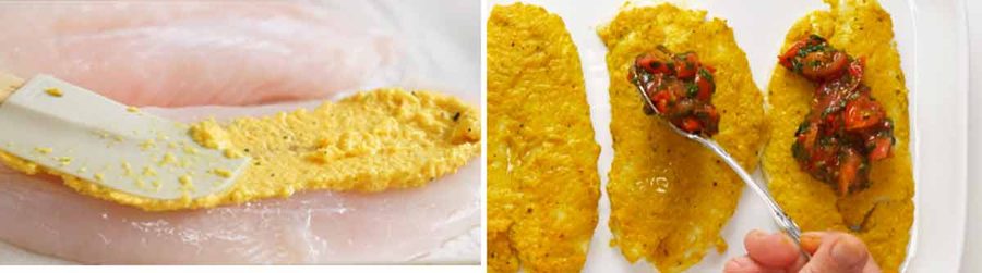 Slather fish (that’s a technical term 😉) – Put the fish on a tray lined with baking paper (parchment paper). Then slather the curry paste on the exposed surface of the fish (not the underside) from edge to edge;