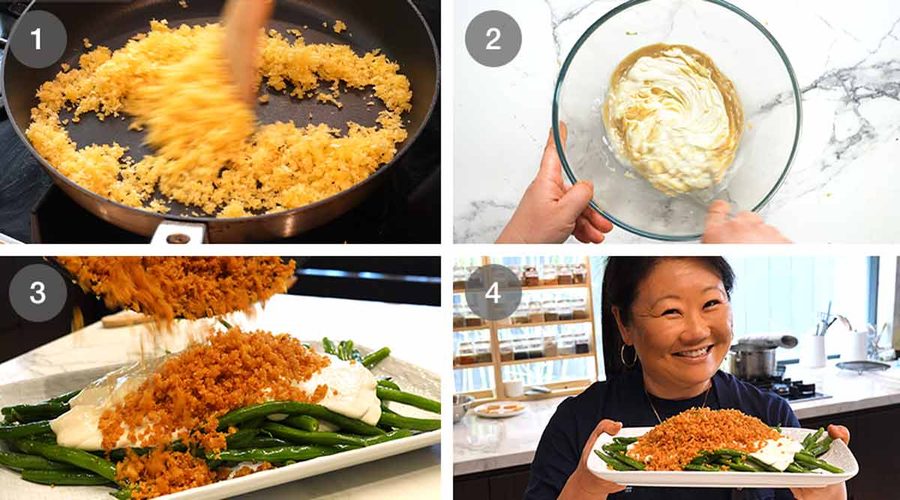 - Toss blanched beans with oil, salt and pepper. Whisk Tahini ingredients, microwave 20 seconds, whisk again. Toast Panko mix on stove. Assemble โ beans, sauce then panko. Attack!