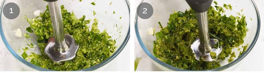 Blitz part 2 – Then add the rest of the green onions and soy sauce, then blitz until all the green onion is pesto-like, about another 15 seconds. A stick blender isn’t strong enough to blitz into a smoothie so you shouldn’t have to worry about taking it too far.