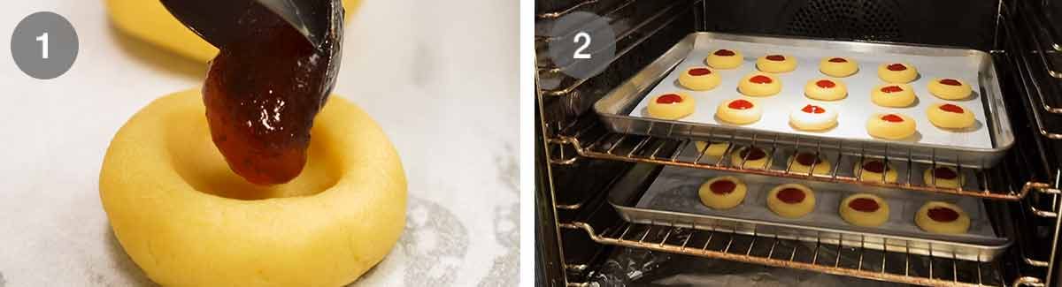 ⚠️ Don’t be too greedy with the jam! Fill so it’s level with the surface of the cookie. It will spread and we don’t want overflow. Also, you can top the jam up after they come out of the oven, if you feel they need it.