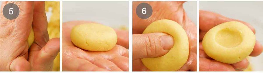 - Cream butter and sugar. Beat in vanilla, egg and salt, then beat in flour. Roll 3cm/1.2" balls (#60 cookie scoop), flatten, indent, fill. Bake 14 minutes 180°C/350°F (160°C fan), cool on tray.