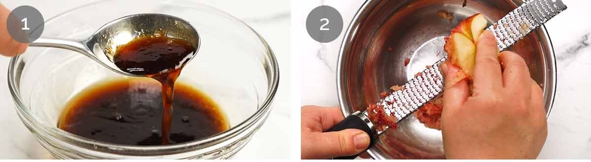 Bulgogi sauce – Use microplane to grate the apple, onion, garlic and ginger into a bowl (no need to peel the ginger, it peels itself back as you grate!). Add remaining ingredients and mix.