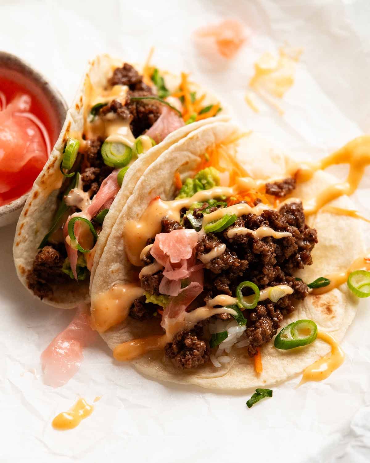 - Assemble – Spoon beef over rice, place spinach and carrot. Top with pickled ginger and a dollop of mashed avocado. Tuck lettuce down the side. Sprinkle with sesame seeds and green onion. Serve with sauce for drizzling all over everything before jumbling it all up and digging in!