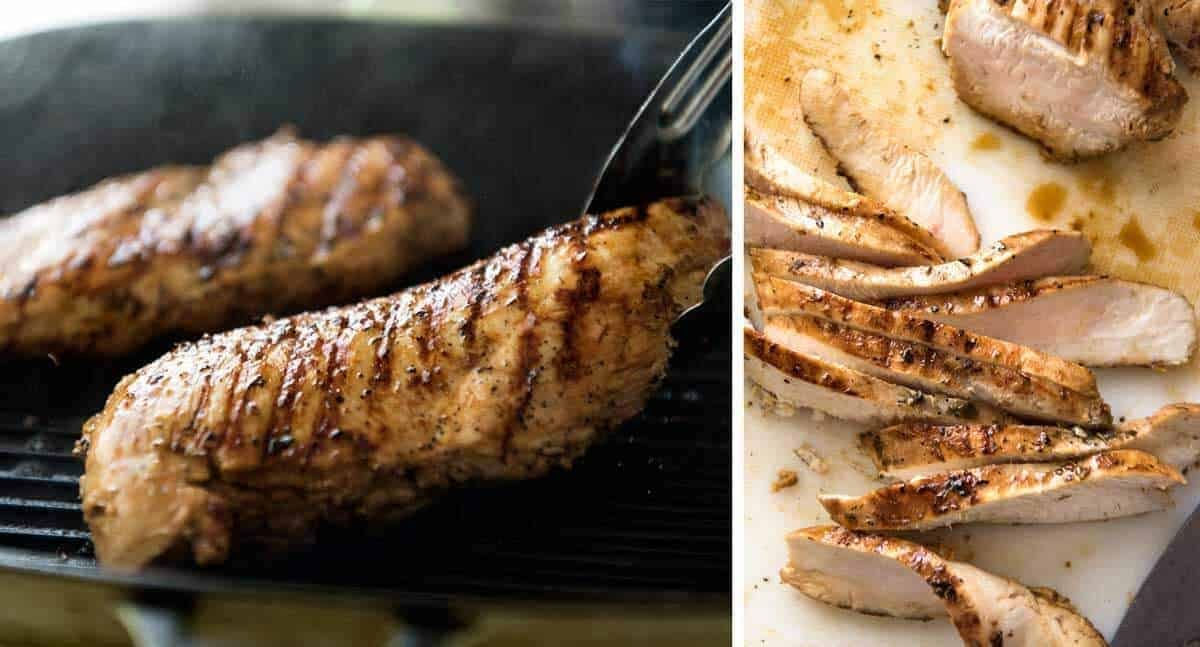 - Use the oil to brush the grill, or heat oil in a skillet over medium high heat. Cook the chicken for 4 minutes on each side, then remove onto a plate. Cover loosely with foil, rest for 5 minutes, then slice thinly.