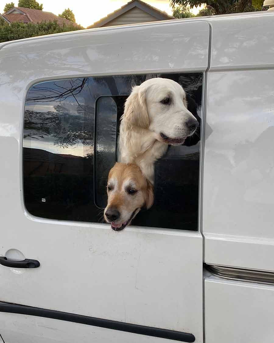 When he spent the day with the boarder and I met her at the dog park for handover – the pretty young one on top is Priscilla – Dozer’s the old face squeezing under her! He’s so pushy.