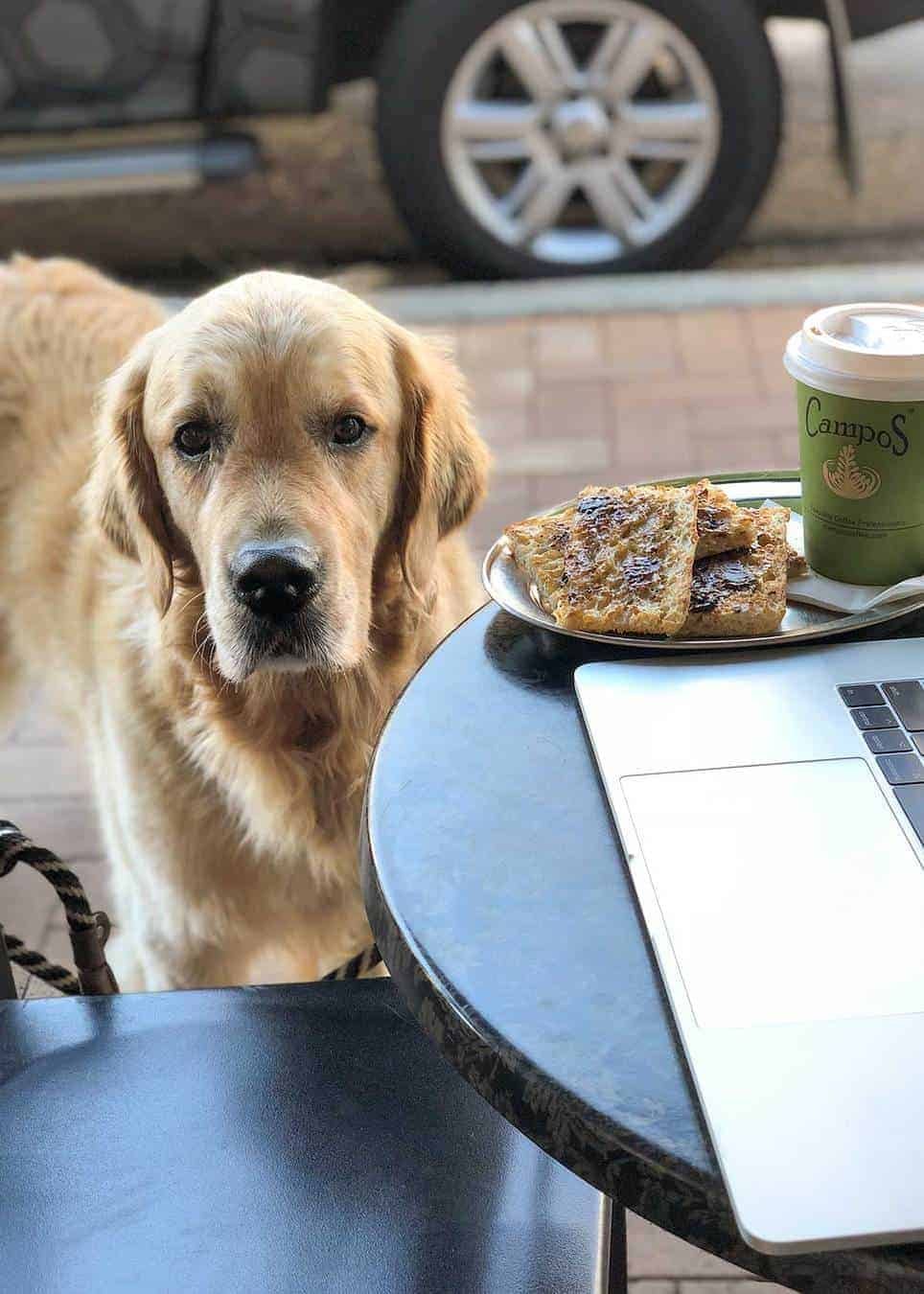 Computer, coffee and Dozer eyeing off the Vegemite toast. Just another morning of work.