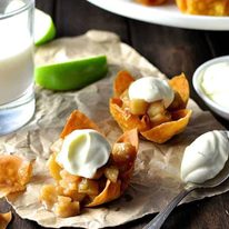 - To serve, spoon still warm Apple Pie Filling into wonton cups and top with a dollop of cream. Serve immediately.