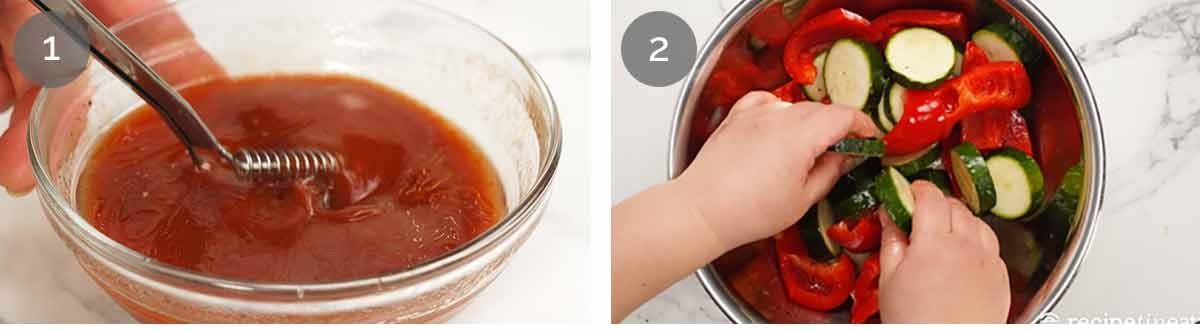 - Toss Vegetables, mix Sauce. Make meatball mixture, roll and squish 16 meatballs, wedge between zucchini rounds, tuck capsicum in. Pour over sauce, bake 35 minutes at 200°C/375°F (180°C fan).