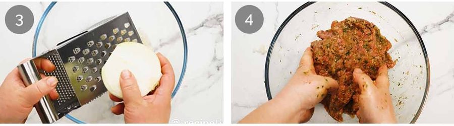 Grate the onion using a standard box grater over the panko breadcrumbs in a bowl. Then use your fingers to toss the breadcrumbs to soak in the onion juices. Flavour, and softer meatballs – the meatballs where I don’t do this are just never as soft!