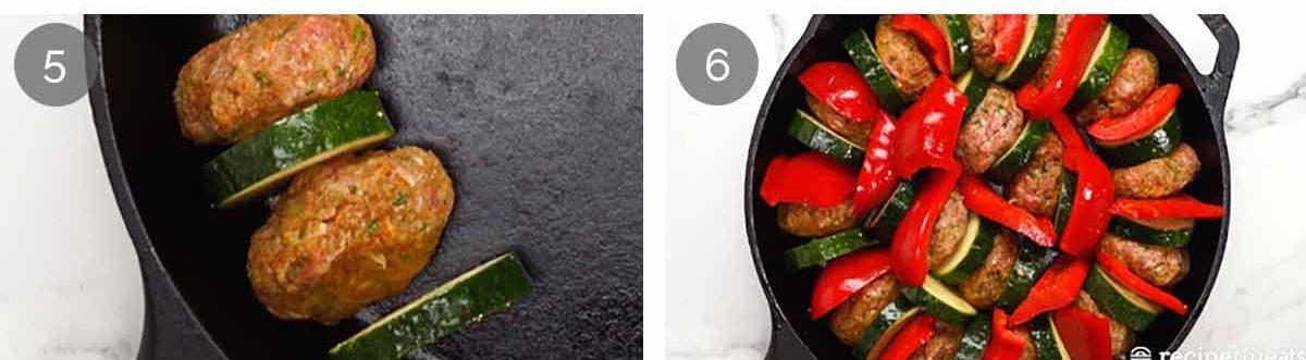 Spiral – Arrange upright, loosely (to allow room for the capsicum), in a skillet or other round pan with a zucchini slice in between. I start on the outer ring then put remaining meatballs and zucchini in the middle.