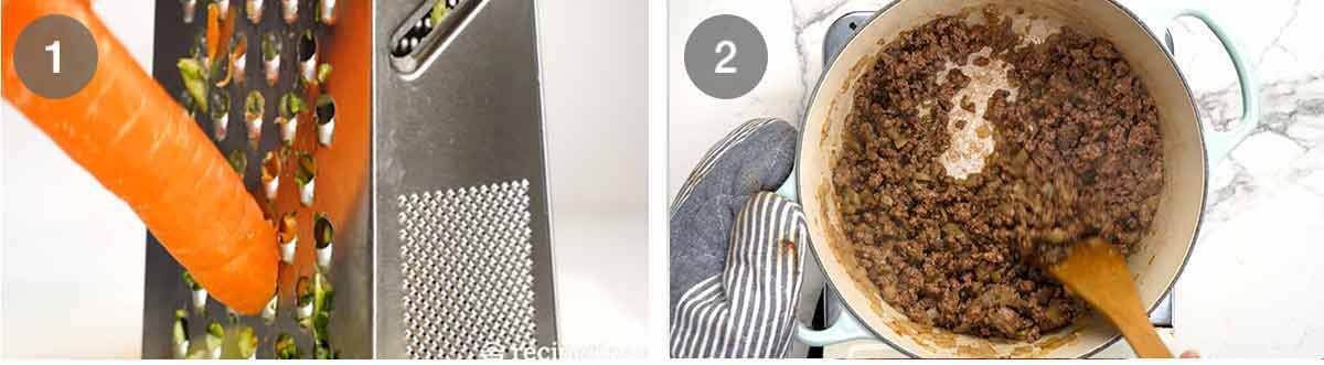- Cook vegetables – Cook the onion and garlic for 2 minutes. Add the beef and cook, breaking it up as you go, until you no longer see red meat. Add the carrot and zucchini, cook for 2 minutes until the water they release mostly evaporates. Add the capsicum and cook for 2 minutes.