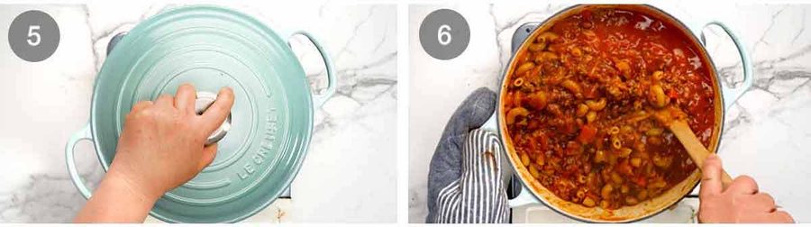 - Add the pasta, stir, let it come back up to the simmer. Put the lid on and lower the heat slightly to medium so the liquid is simmering (not bubbling madly).