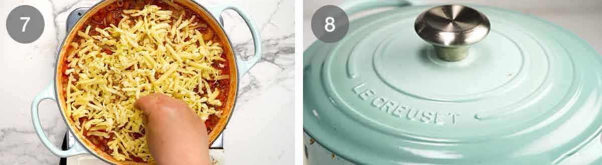 - Melt cheese – Give it a stir, smooth the surface, sprinkle with cheese. Put the lid on then turn the stove off (leave the pot on the stove). Leave for 3 minutes so the residual heat melts the cheese and the pasta finishes cooking.