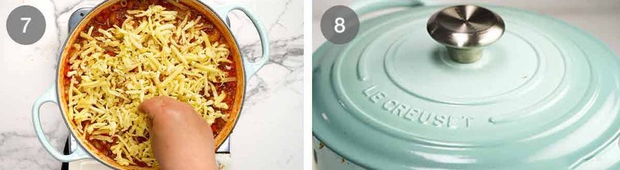 If making the whole dish ahead to reheat another day, stop when the pasta is cooked but don’t put the cheese on. Take it off the stove and let it cool with the lid off. You could even transfer into an ovenproof dish at this stage. Sprinkle with cheese then fridge or freeze!