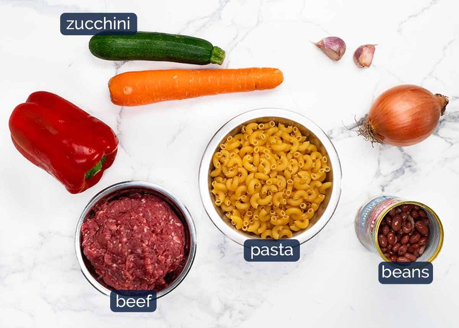 In this recipe, we’ve got a carrot, zucchini, and capsicum (bell pepper) with 500g/1 lb of beef, plus there’s also 800g/28 oz canned tomato and an onion (these count as vegetables too!) All these vegetables not only boosts nutrition but also stretches the dish to serve 7-8 people instead of the usual 4-5.