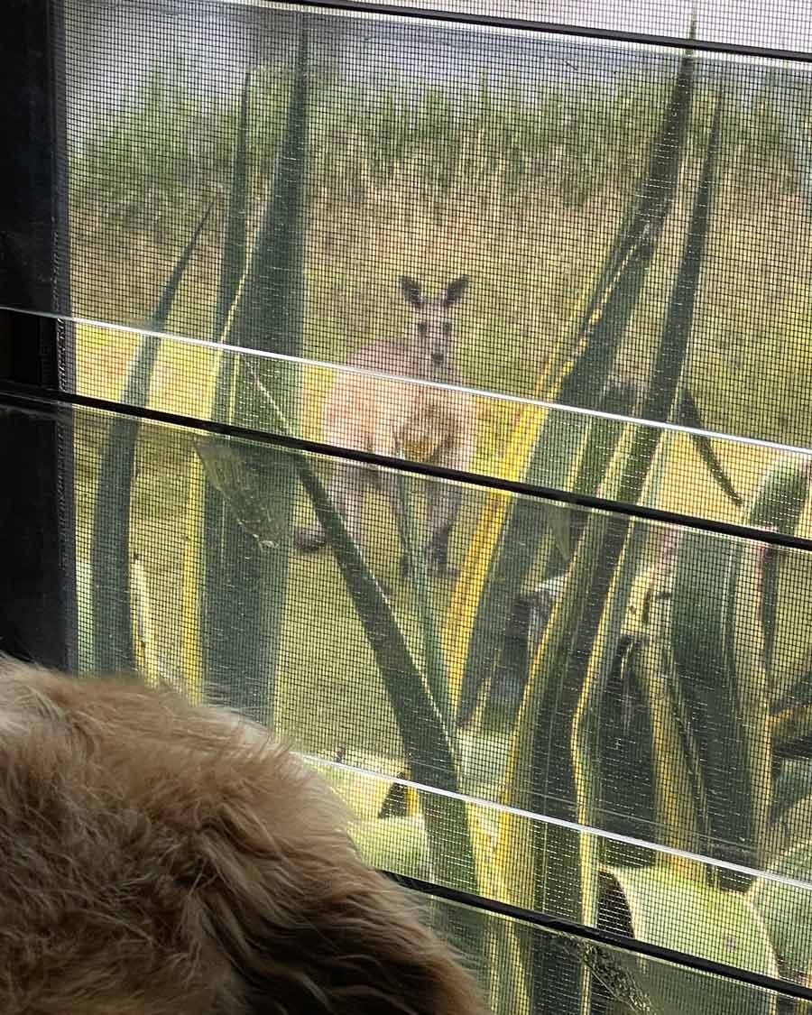 Took Dozer up to the Hunter Valley* last weekend. Stayed at lovely dog friendly cabins called Tonic. Plans to sleep in didn’t quite happen due to his “enthusiastic” barking at the sight of early morning kangaroo visitors (below). Visions of him prancing around vineyards also did not eventuate after being warned of kangaroos beating up dogs (seriously) and seeing this video on YouTube. Dozer would stand no chance against a roo. We both know it!