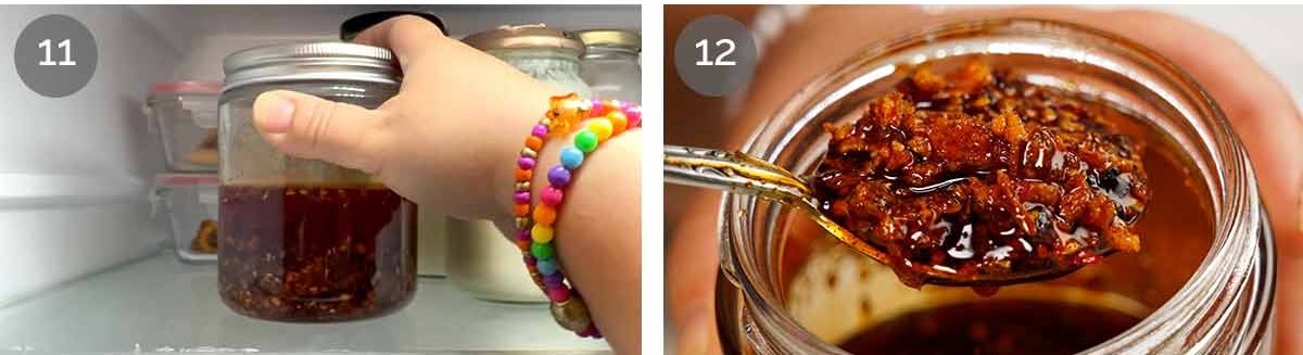 - Infuse overnight – Pour into a jar or airtight container. Once fully cool, seal with a lid. Leave for at least 24 hours to let all the flavours meld. It just gets better with time, peaking on day 3 onwards. Keeps in the fridge for 6 to 8 weeks. Always mix well before using, being sure to agitate all the good stuff into the oil!