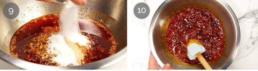 Crispy fried garlic – Use 1 tablespoon of granulated garlic (dried garlic flakes – easy to find at regular shops). Add it with the sesame seeds. Also add 5 smashed garlic cloves with the ginger to infuse in the oil.