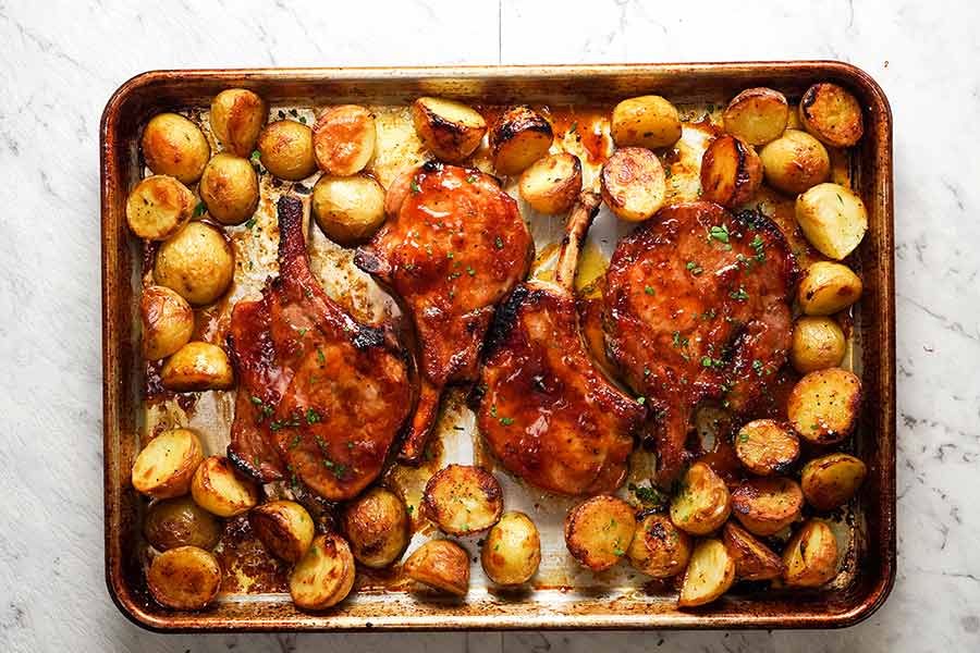Wow! Amazing! I followed the glaze recipe but for cooking I used a flat bottom porcelain bowl instead of a baking sheet to concentrate the glaze while cooking, especially for the potatoes. I doubled the amounts for the glaze to get more juice for the potatoes. The chops were thick so they took 30 min to cook. Instead of broiling I cut the chops up in big cubes towards the end and rolled them in the glaze to finish the cooking over 5 min.
