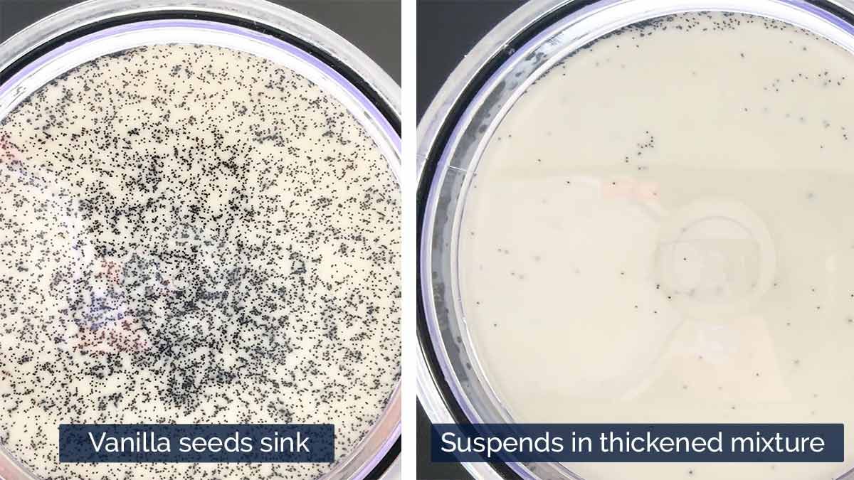 Fridge before pouring – Pour the mixture in a jug or bowl (preferably a clear one, so you can check for sinking vanilla seeds). Then refrigerate for 1 hour, stirring well at the 30 minute and 45 minute mark, scraping the sides (to ensure it doesn’t start setting), until the mixture has a consistency like thickened cream (heavy cream) so it’s thick enough to keep the vanilla seeds suspended rather than settling on the base – see photo below for before and after. Check: Stir, set aside for 15 seconds, check the base of the jug to see if they settle. If not, we’re good to pour!