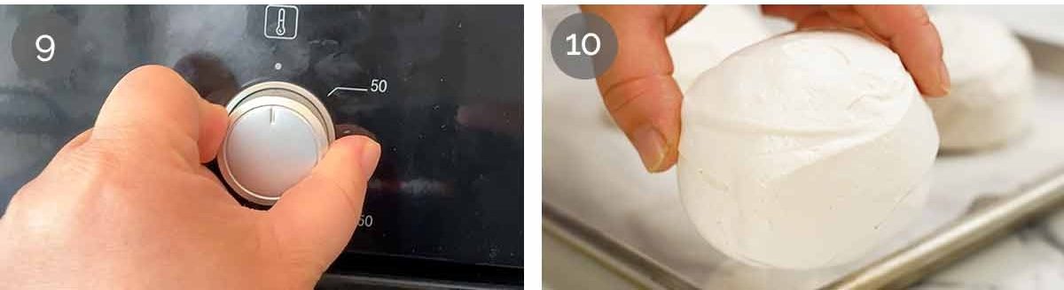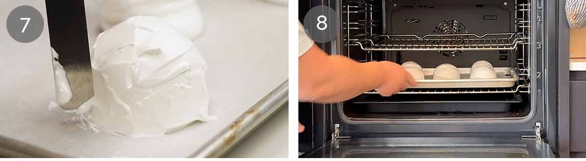 - Pipe mounds Transfer meringue mixture into a large piping bag. Snip the end to make a large 2cm / 0.8" hold. Pipe 5 mounds on the tray, then smooth into domes that are taller than they are wide (they flatten slightly when baked). Mine are about 4 cm / 1.6" wide and 6.5cm /2.6" tall. Use a small offset spatula or butter knife to smooth into a dome shape (no need to be perfect, it gets decorated later).