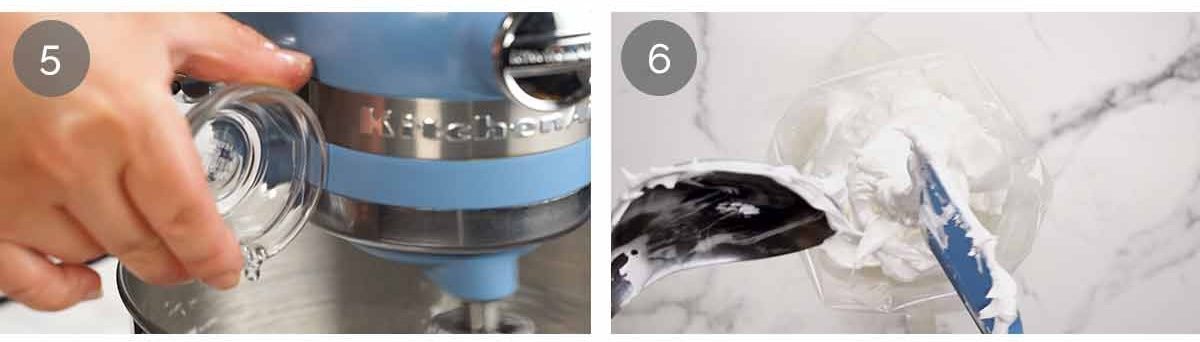 Vinegar & cornflour – Beat 5 minutes on speed 10. The whites will become thick and glossy, and when you rub between your fingers there should be no sugar grit remaining. If there is, keep beating. Add the vinegar and cornflour then beat for a further 30 seconds.
