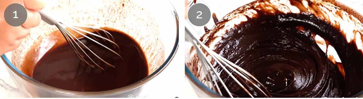 - Batter – Add sugar, mix, then add eggs and vanilla and mix well until smooth and molten. Add flour, cocoa and salt. Stir until smooth.