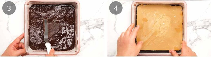 So, I reverted back to my usual freezing method and it worked perfectly. And so easy. Yes, you have to wait for the peanut butter to freeze. But once that’s done, just place the frozen peanut butter slab on a layer of brownie then cover with more brownie.