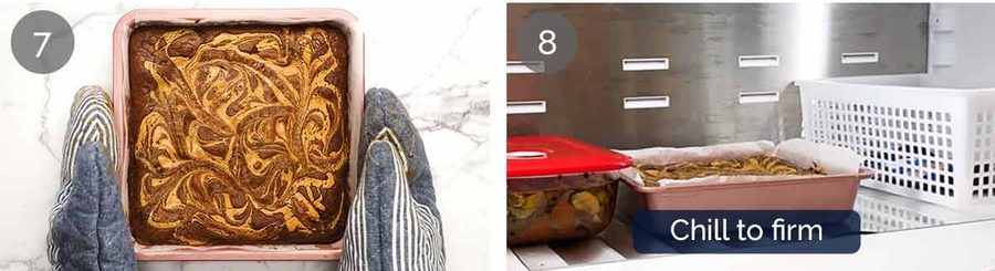Swirl – then make swirls by dragging a butter knife or back of a teaspoon across the surface. Make shallow grooves if needed using the flat side of the knife or the back of a teaspoon to reveal sufficient brownie batter. The brownie batter firms up because it gets chilled from the frozen peanut butter slab, but it will melt and level out in the oven. No need to stress about this step – be bold and brave! It always looks pretty. 🙂