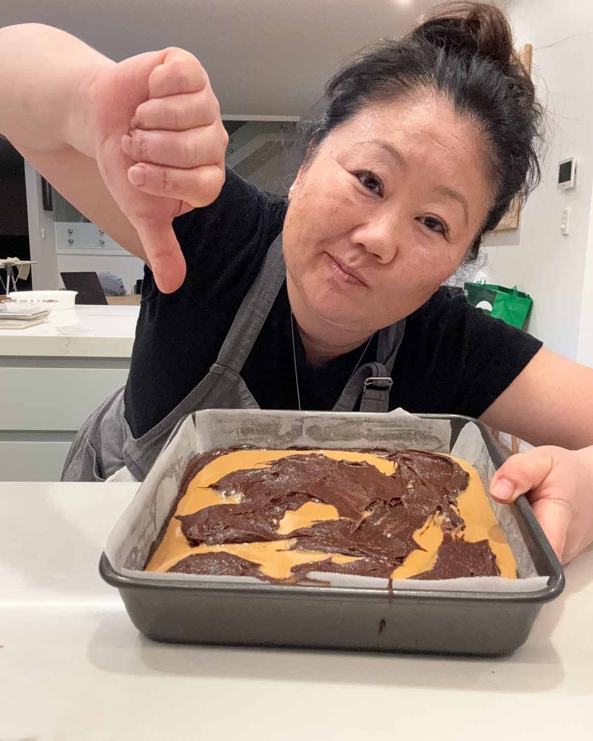 It does not work! Brownie batter is too soft to spread the peanut butter across the surface, and the brownie batter is too thick to spread over the peanut butter! 🤯