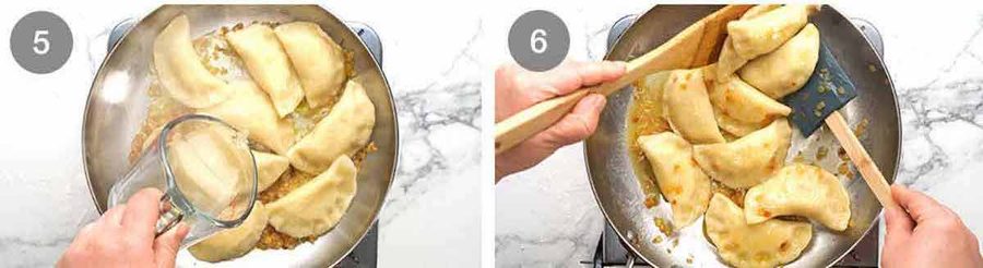 Toss for 1 minute, still on the stove, until the pierogis are coated in the butter sauce. You’ll see it goes from watery (when you first add the water) to thickened so it sticks to the surface of the pierogi.