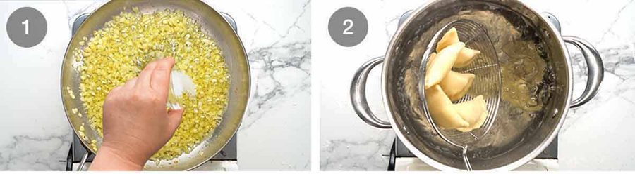 Sauté onion first – Sauté chopped onion in butter until golden on the edges. Then transfer into a bowl or container and use as much or as little as you want for whatever size serving of pierogis you are making. 1 large onion is enough for 30 pierogis because they are only sparingly scattered with onion, like pictured. Cook onion will keep for 5 days in the fridge, or freezer for 3 months.