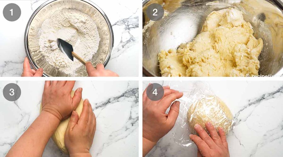 - Mix dough – Whisk the flour and salt in a mixing bowl. Make a well in the centre and then add the butter water plus egg. Mix to combine into a shaggy dough.