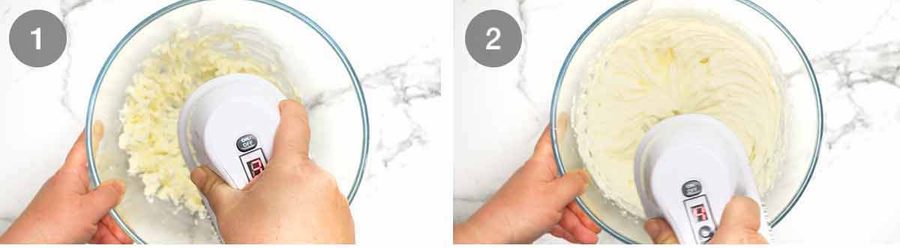 Cream cheese first – Beat the cream cheese until soft and fluffy. Take a good 2 minutes on medium high speed to do this so you cream it really well. This is important because the cream is cold so it won’t blend in easily with the cream cheese (ie when you whip the cream, it can cause cream cheese lumps). To avoid this problem, you want to beat the cream cheese until it is really soft and creamy so it mixes in seamlessly with the cream.