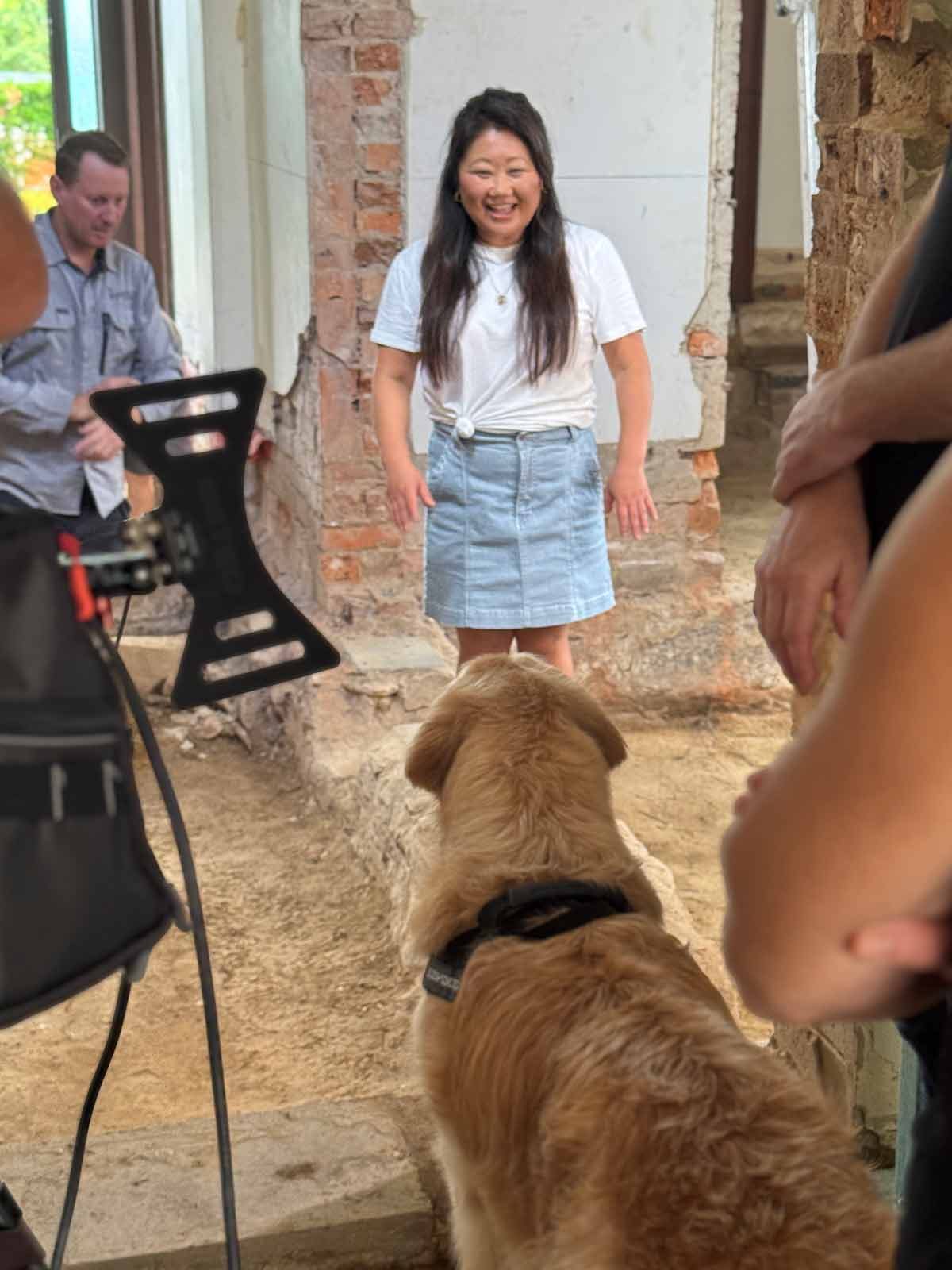 It even got to the point where he was ruining takes – just look at JB’s face in the photo below as Dozer howls mid-filming. So, we had to assign someone the very important (full-time) job of being the official Dozer silencer. That lucky person was Candice, my publicist from Pan Macmillan (my publisher). Poor thing had to endure smelly old-man Dozer breath huffed and barked in her face all afternoon! 😂