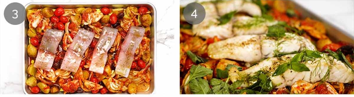Top with fish – Then put the fish on top, drizzle everything with olive oil and bake for another 15 minutes or until the fish flakes easily.