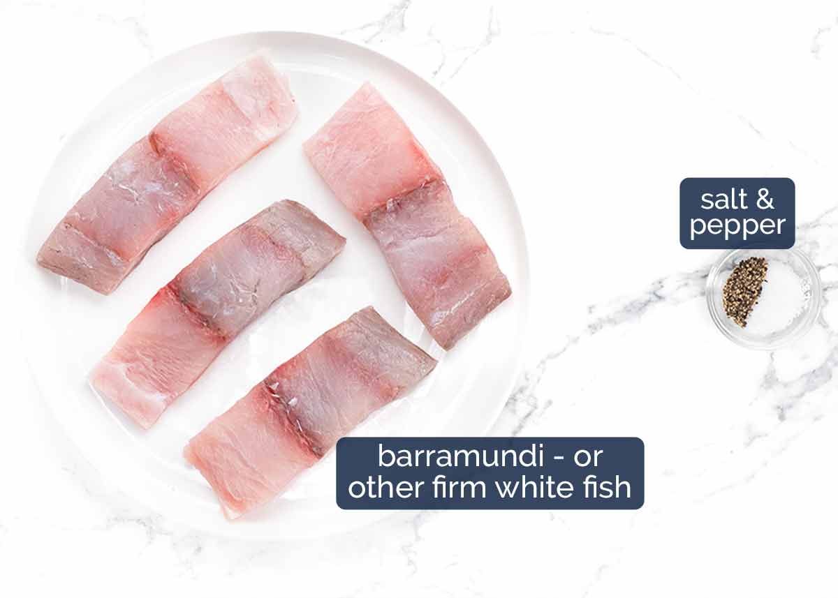 - 4 x 160 – 180g / 6oz barramundi fillets , skinless, or other firm fish fillets about 2.5/3cm/1" thick (Note 4)