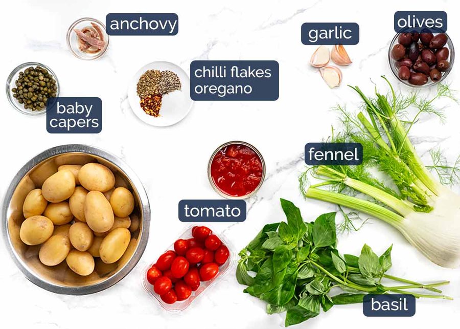 Here’s what you need for the puttanesca-ish part – most of the ingredients used in puttanesca plus potatoes to bulk it out and fennel for flavour and a touch of grown-up sweetness (it’s really good, urge you not to skip it!).