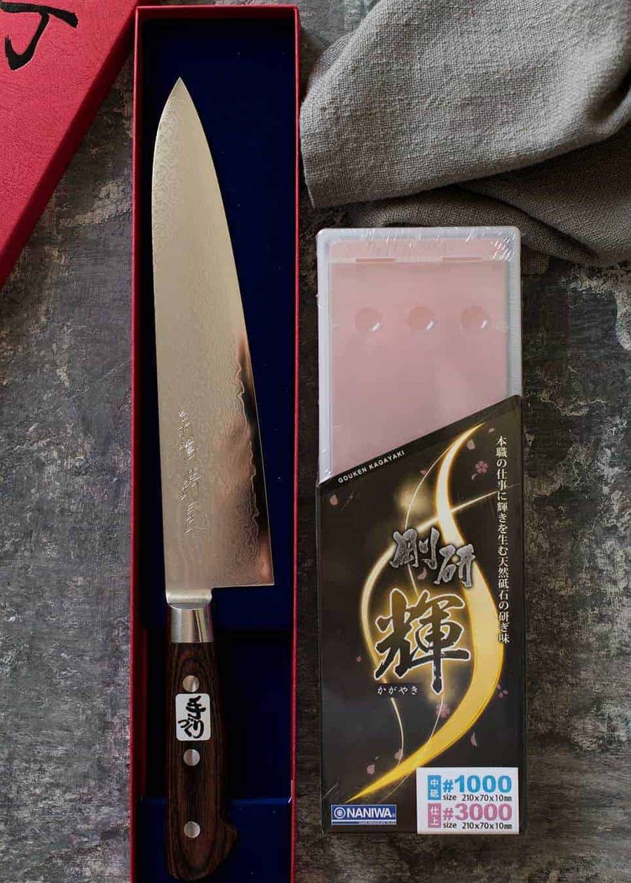 Global (second pick, widely available, solid, reliable everyday Chef knife): Global 20cm/8″ G-2 Cooks Knife plus a sharpener (everyday sharpener, or pro version rod + whetsone). Knife on sale here for $119 (RRP A$199).
