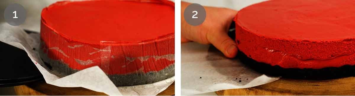 Colour check – Whatever the colour the filling is at this stage, it will be slightly paler in the finished cheesecake after the cream is added. Feel free to add more red colouring if you like, but don’t add more chocolate because it will weigh the filling down too much and make it denser (I found 150g/5oz was the limit).