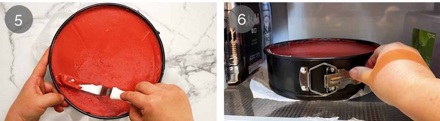Butter and line – Spray the base with oil or grease very lightly with butter, just enough to hold a square(ish) piece of baking paper (parchment paper) in place so it’s not sliding around when you clip the sides in.