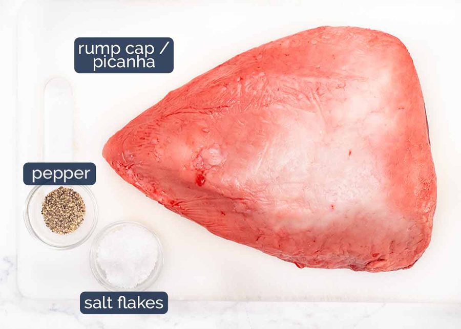 All you need to roast beef rump cap is salt and pepper. No oil – the fat cap provides plenty, and we roast at a low temperature so the fat melts and bastes the meat.
