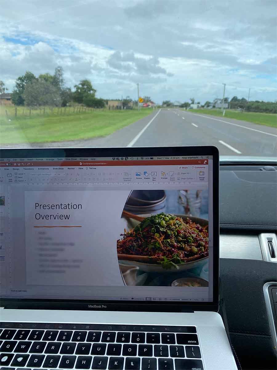 Typical scene from a road trip up north – Dozer sprawled across the entire back seat. Me, trying to get some work done in the front (passenger 🙂) seat!